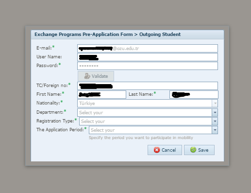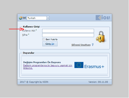 - Then, select the program (Erasmus+) and your status (Student/Outgoing Student) and insert your OzU username/password.